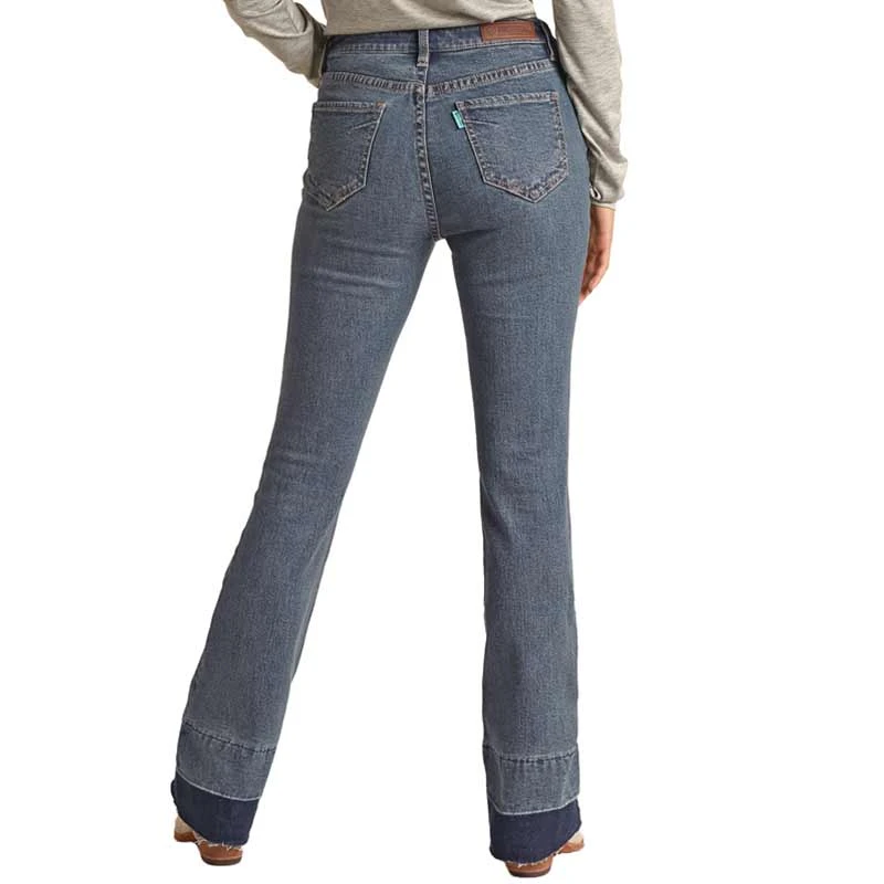 These high rise jeans with extra stretch from Rock & Roll Denim feature a medium vintage wash, copper topstitching, and released wide hem.