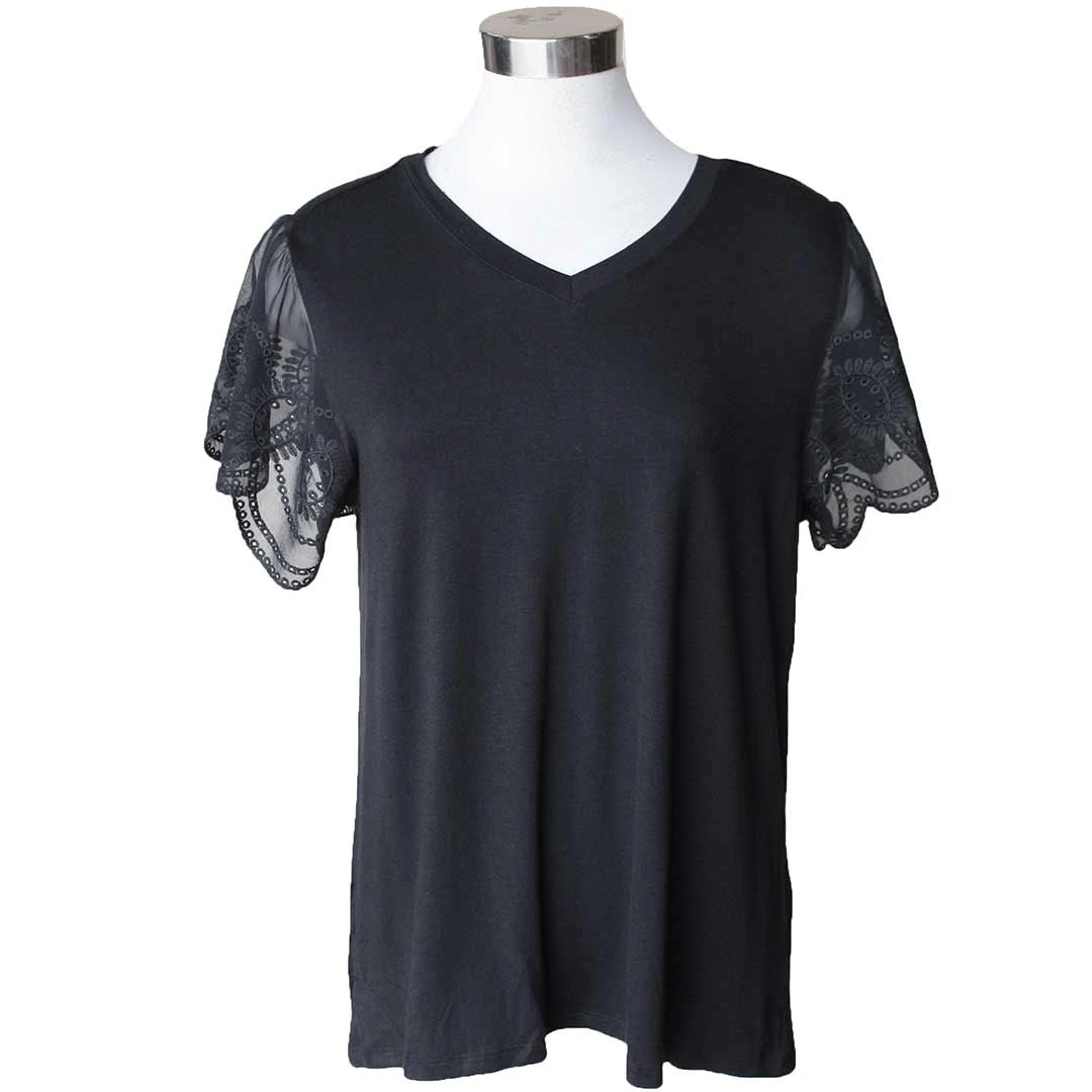 The perfect black t-shirt! From Keren Hart, this women’s t-shirt has a V neckline and features lace flutter sleeves. Perfect for business casual or just casual look.