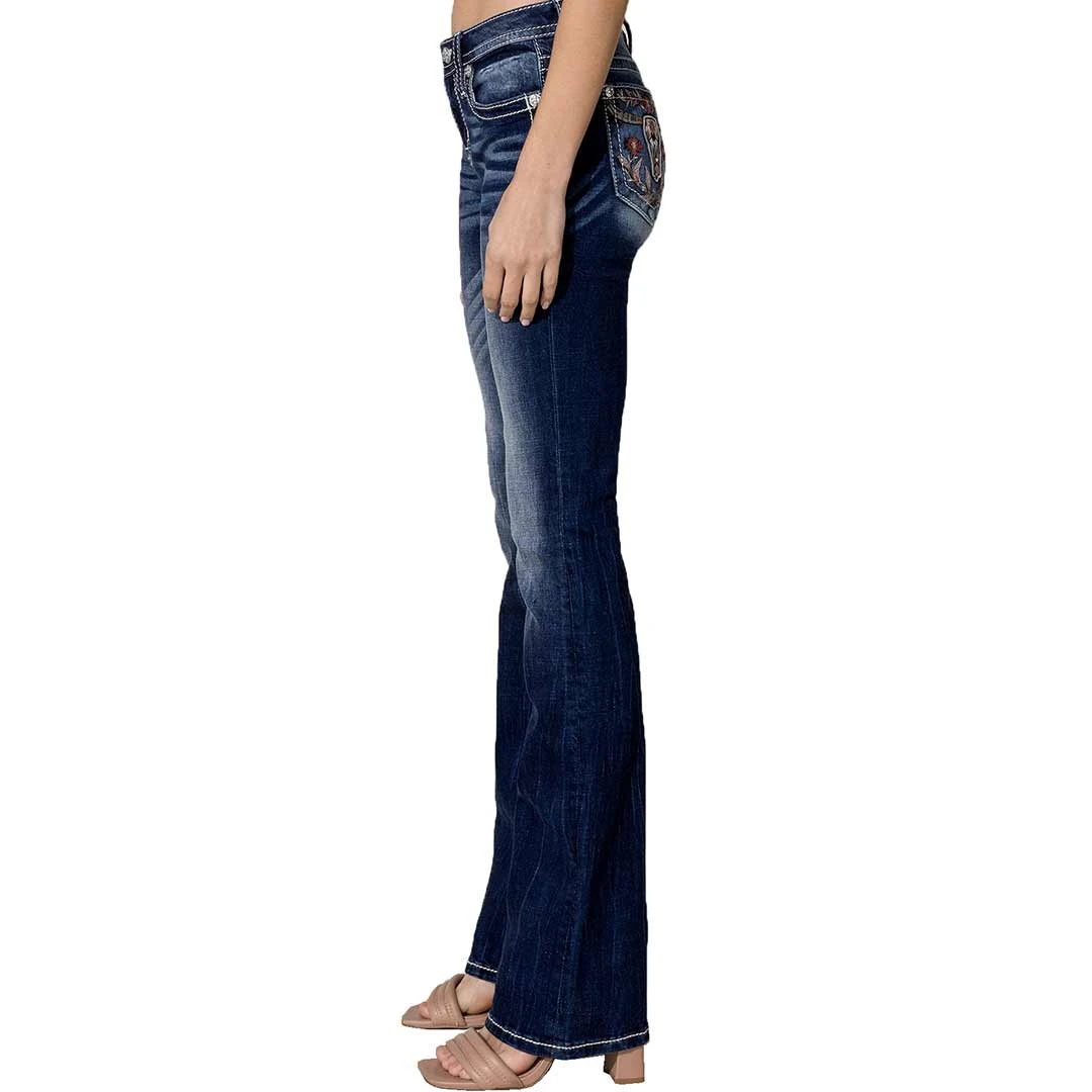 Mid rise dark wash bootcut detailed with hand sanding, embroidered steer head and a 5 pocket with rhinestone rivets from Miss Me.