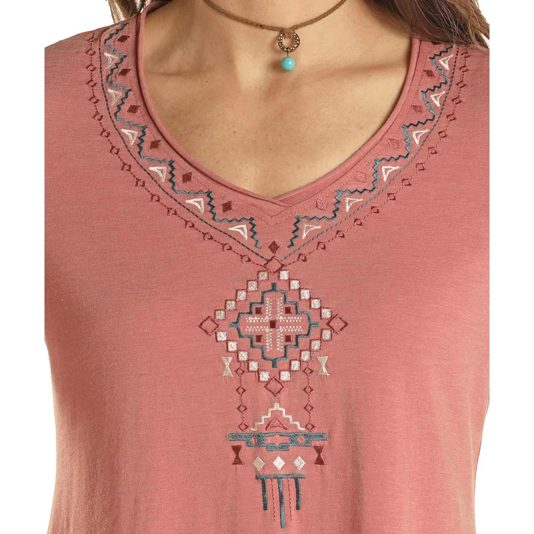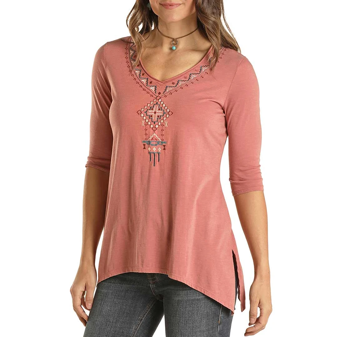 From Rock & Roll Cowgirl this 3/4 sleeve tee features a shark bite hem, side slits and southwest inspired embroidery around neck and down the front.