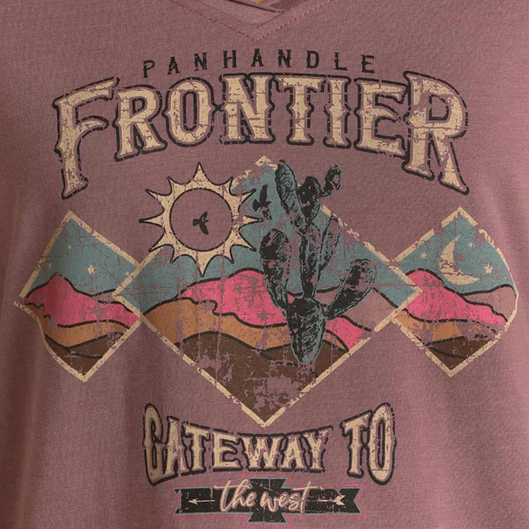 From Panhandle this women’s long sleeve t-shirt features a V-neck, regular fit and a frontier screenprint graphic.