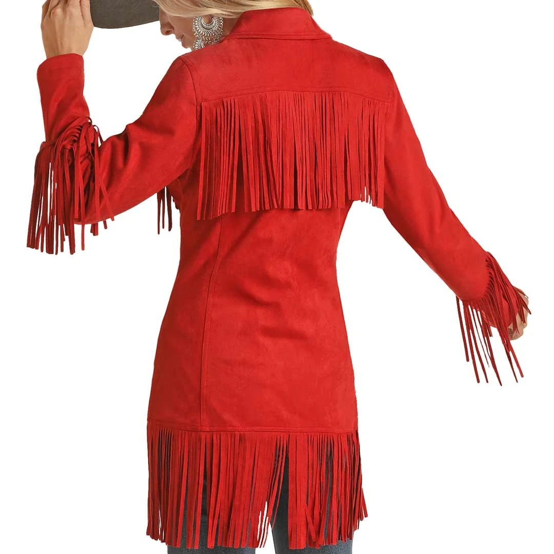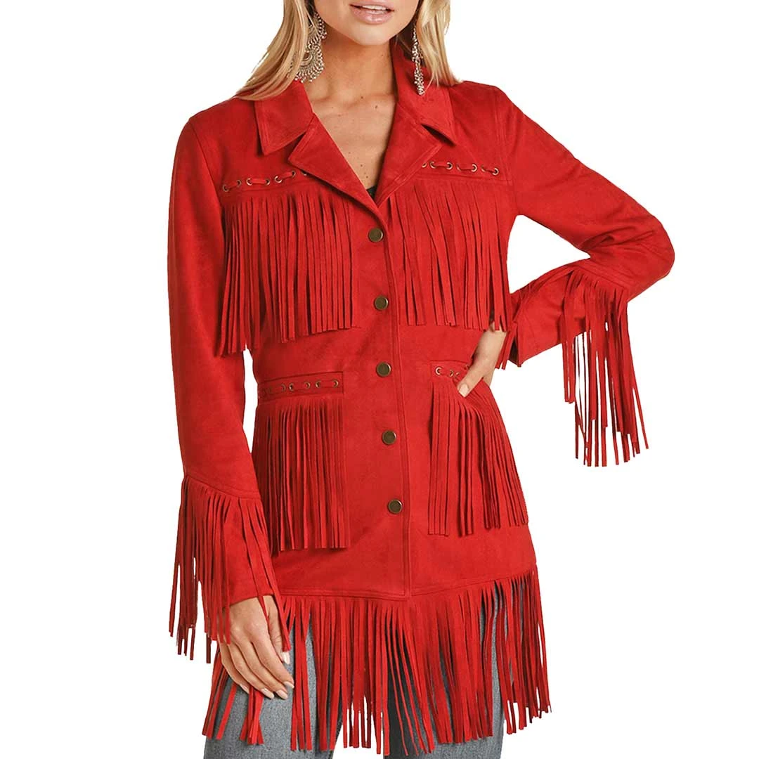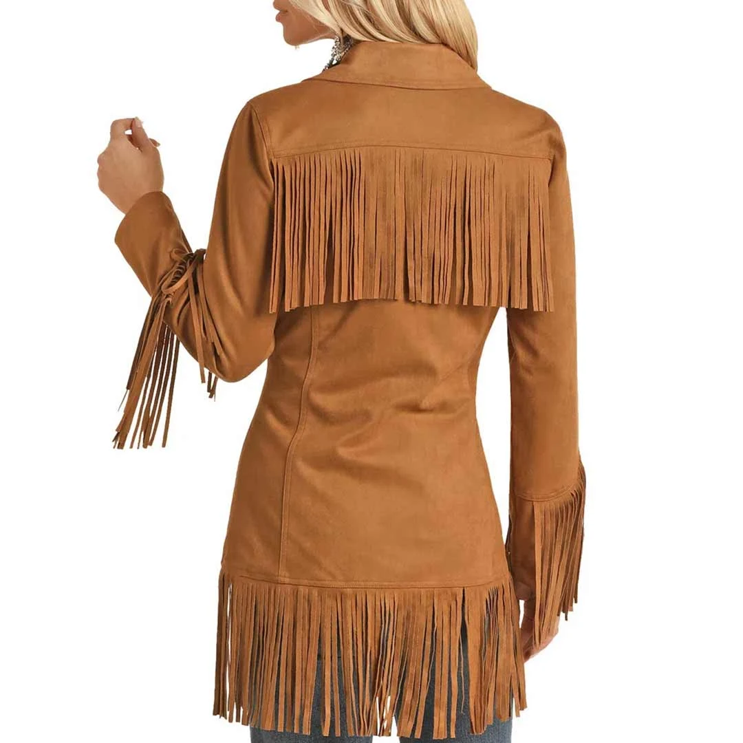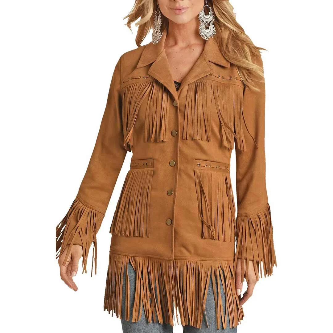 Nothing beats a suede jacket for style this fall season. From Powder River Outfitters, this jacket features snap front closure, fringe on the yokes, waist, forearm and bottom hem and eyelet lacing on the yokes and waist.