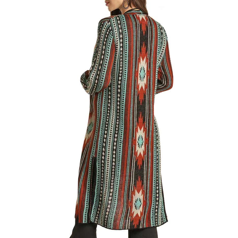 The perfect piece to take you into winter worn with a shirt and jeans or overtop of a dress for a layered look. From Rock & Roll Cowgirl this duster features an all over Aztec print and an open front.