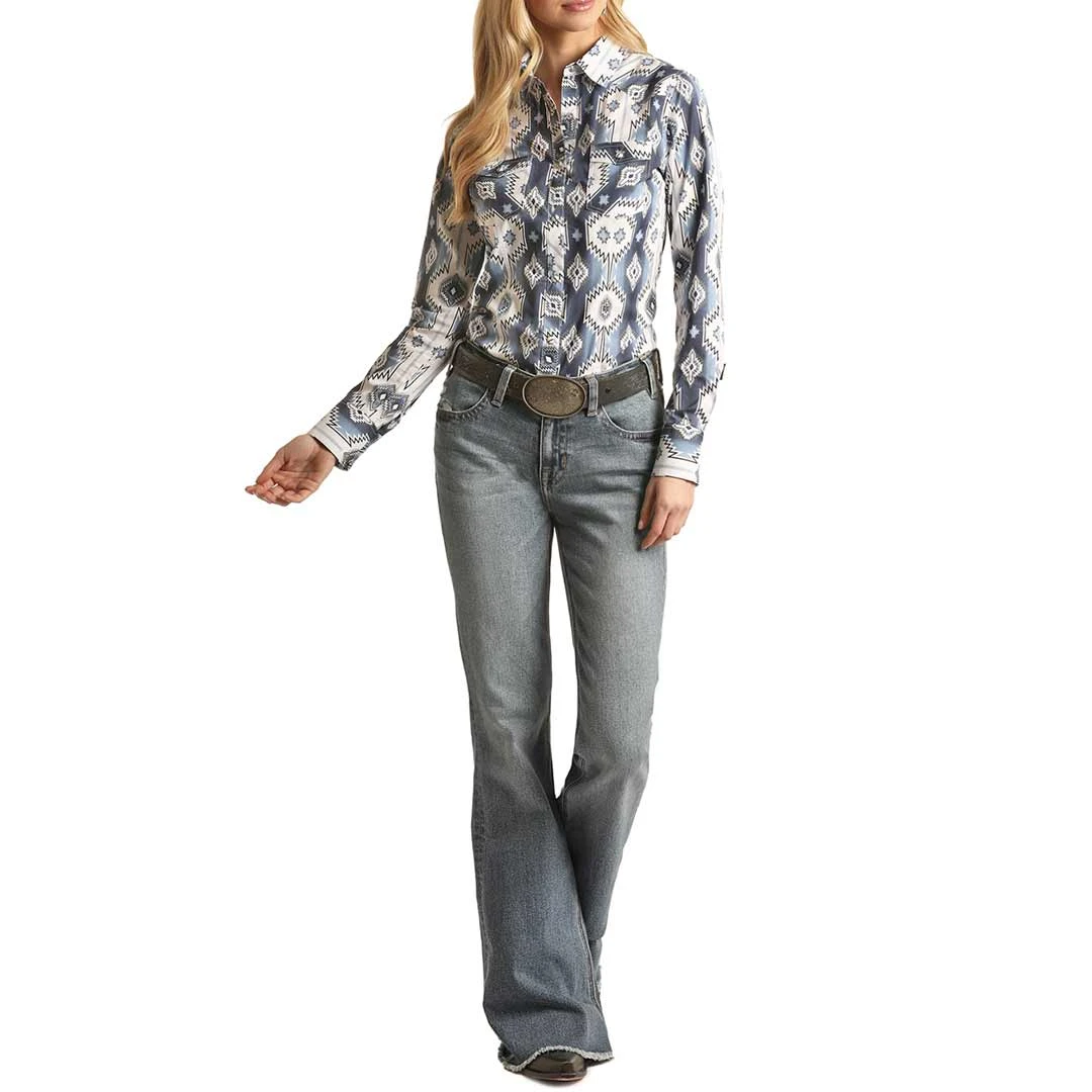 This classic western style shirt from Rock and Roll Cowgirl collection features Aztec print with 2 snap flap pockets.