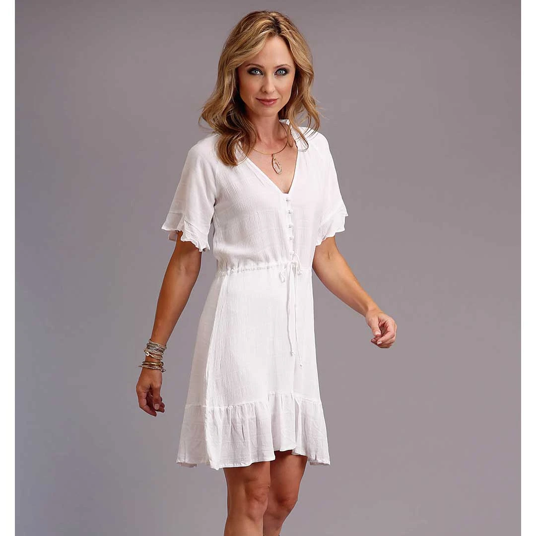 We love this textured rayon dress from Stetson! With all its subtle feminine features like a V-neck with self covered buttons, oversized short raglan sleeves and a deep ruffle hem, you’ll love it too!